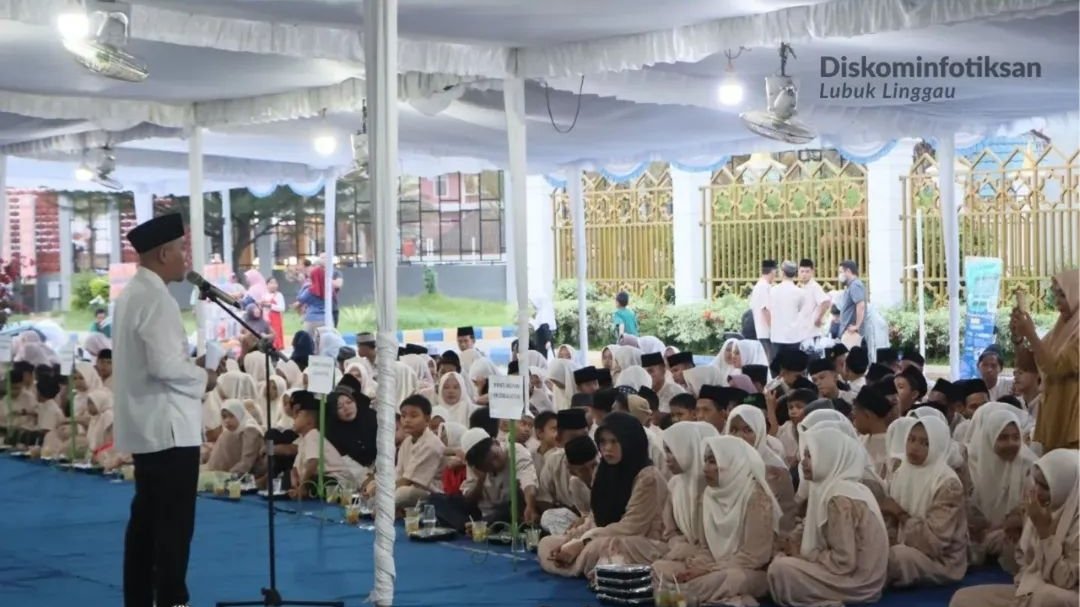 BMP – LUBUK LINGGAU – Wali Kota Lubuk Linggau, H. Rachmat Hidayat beserta Istri Ketua TP PKK Lubuk Linggau, Hj. Risca Priba Ayu didampingi Wakil Wali Kota Lubuk Linggau, H. Rustam Effendi beserta Istri Ketua GOW Lubuk Linggau, Hj. Mipta Hulummi melaksanakan kegiatan buka puasa bersama anak-anak panti asuhan se-Kota Lubuk Linggau Tahun 1447 H/2026 M di pelataran Masjid Agung As-Salam Kota Lubuk Linggau, Minggu (15/3/2026).