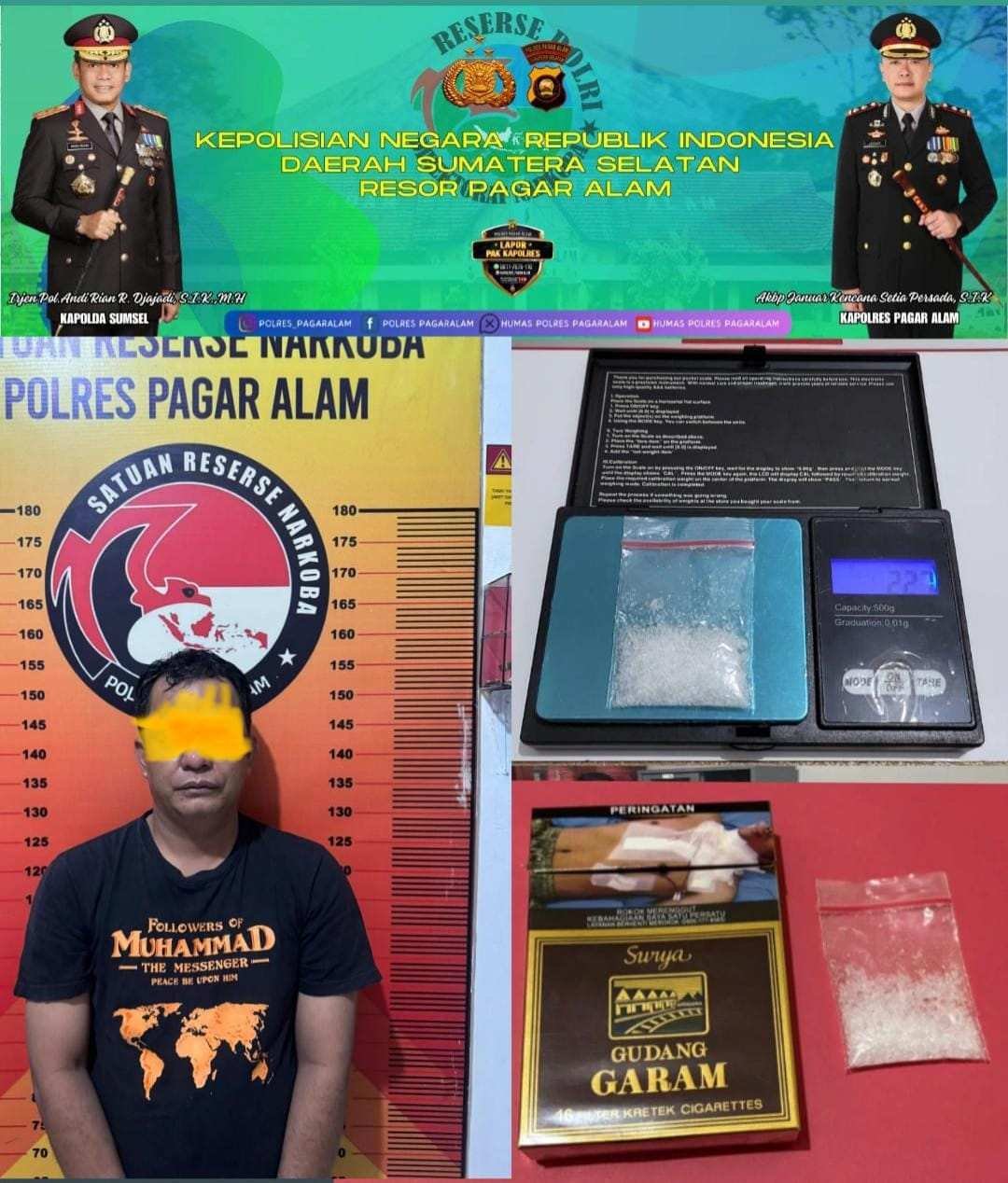 “Pelaku mengakui bahwa barang bukti tersebut adalah miliknya yang diperoleh dari seseorang berinisial M melalui perantara B. Saat ini pelaku telah diamankan di Polres Pagar Alam untuk menjalani proses penyidikan lebih lanjut,” jelas Kasat Narkoba.